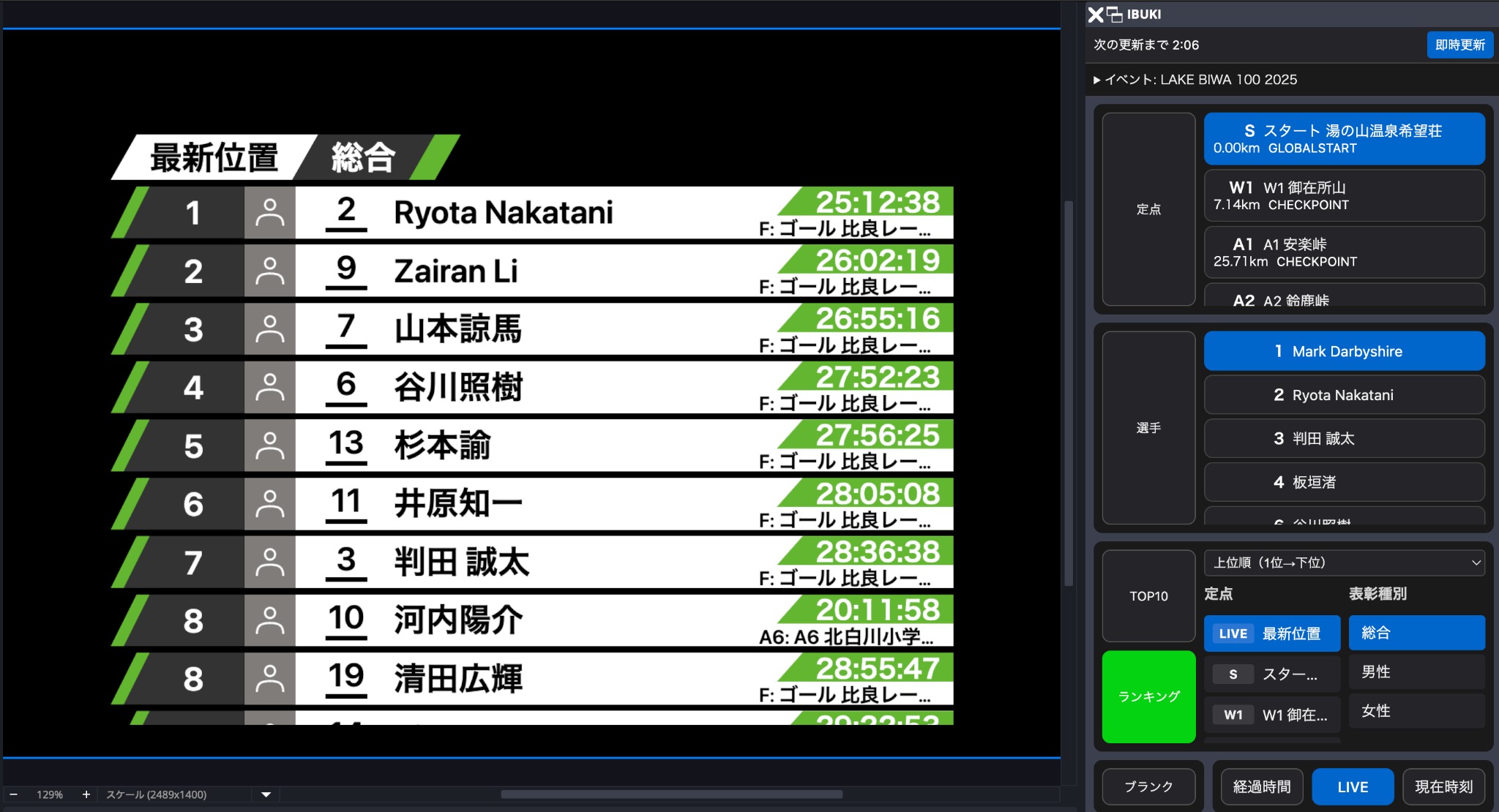 映像配信時には、映像が撮影されたコース上の位置を地図上に表示。 さらに、年間100大会以上で導入されているGPSトラッキングシステム「IBUKI Track」と連携し、 リアルタイムの中間通過情報やゴール順位、選手プロフィールなどを同時に表示可能です。
